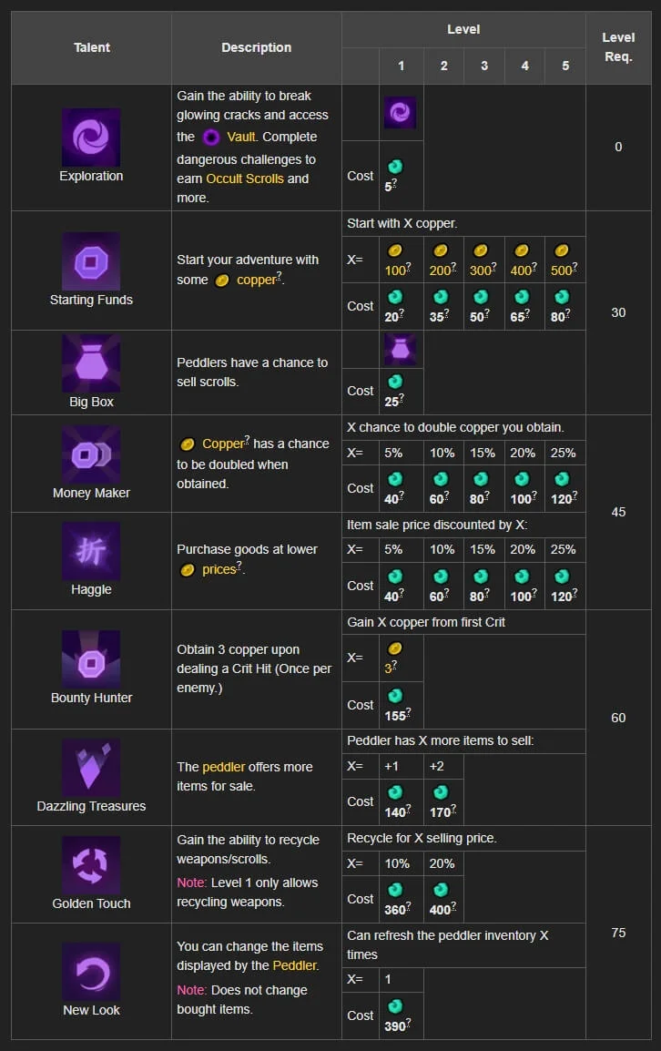 Điểm Talent không mất đi trừ phi bạn tạo mới toàn bộ game để bắt đầu lại, nó cho bạn sức mạnh vĩnh viễn và cần thiết trải dài từ lv1 đến 100 hoặc hơn.