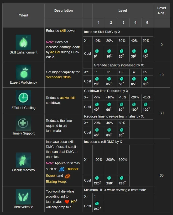 Những điểm Talent (tài năng) thích hợp cho người mới chơi, áp dụng cho giai đoạn ban đầu ở chế độ Normal/Elite khi lv30-45.